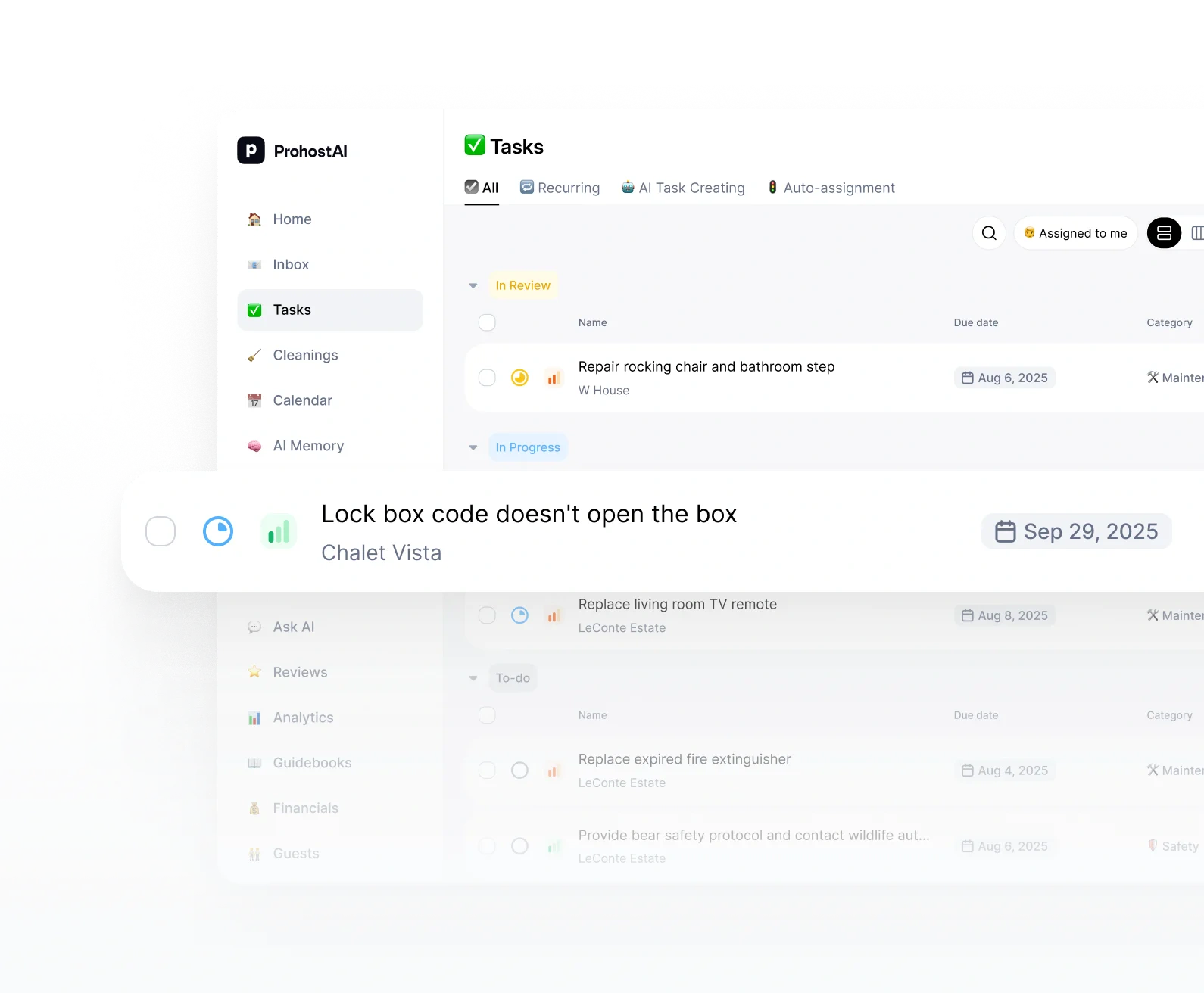Automatically generates maintenance tasks from guest messages and reviews, with auto-assignment and status tracking.