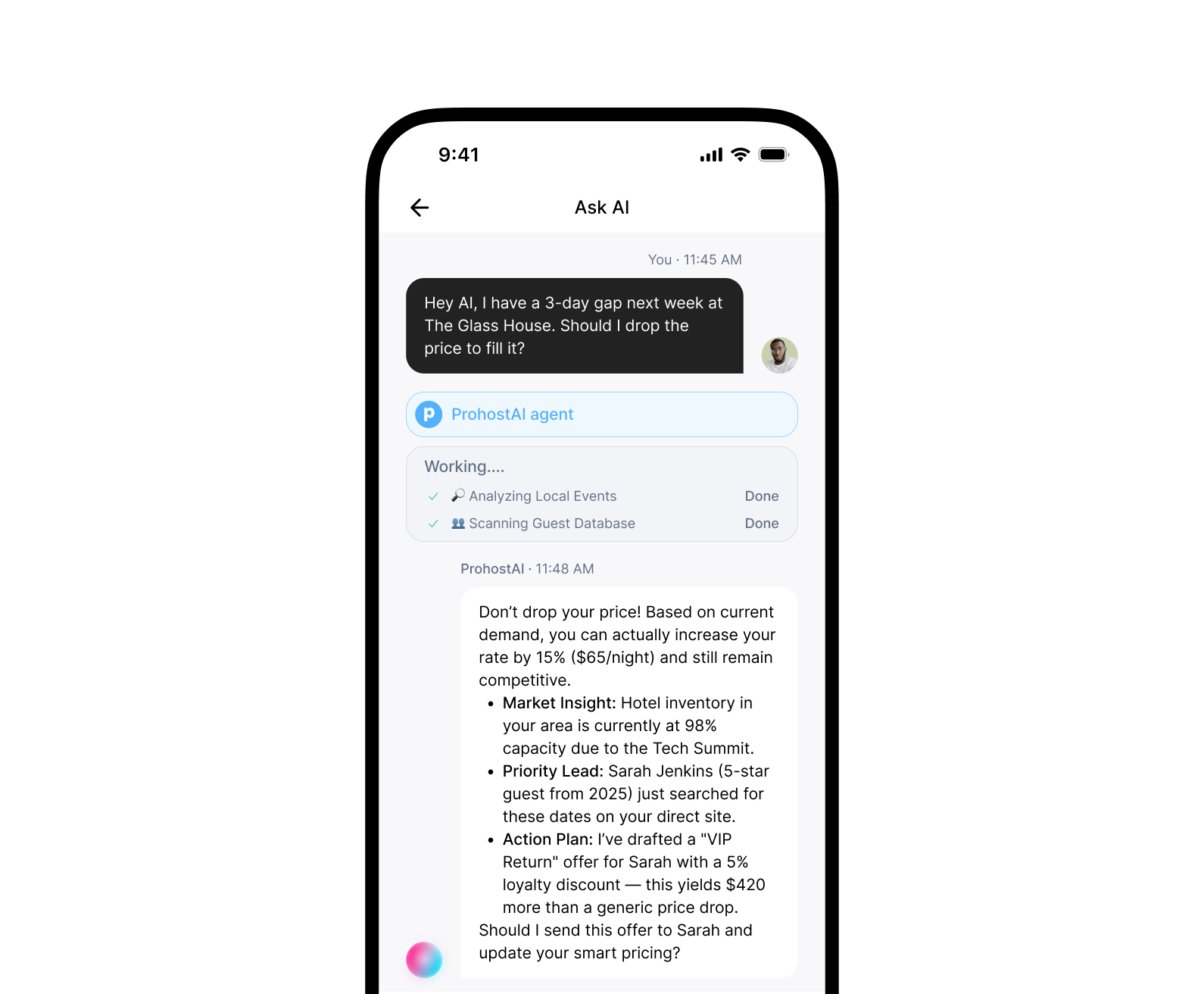Use the Ask AI agent to get things done on ProhostAI. Create cleaning checklists, update guidebooks, analyze reviews, manage tasks and cleanings, and more—just by asking.