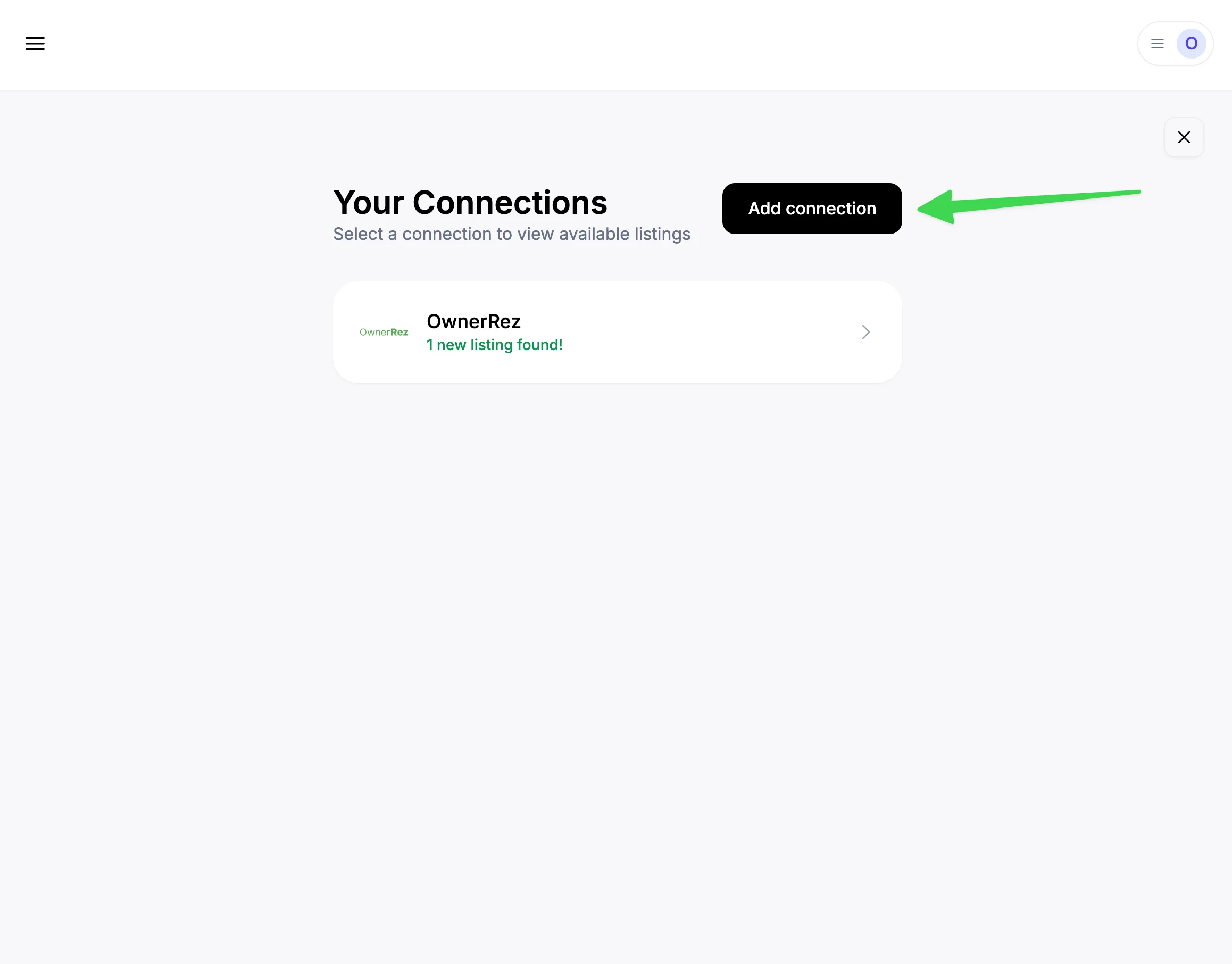 Then in ProhostAI, go to Listings => Add listings => Add connection => OwnerRez. If you haven't connected any listings before, you will see the pop up below. Click on "Connect listings"