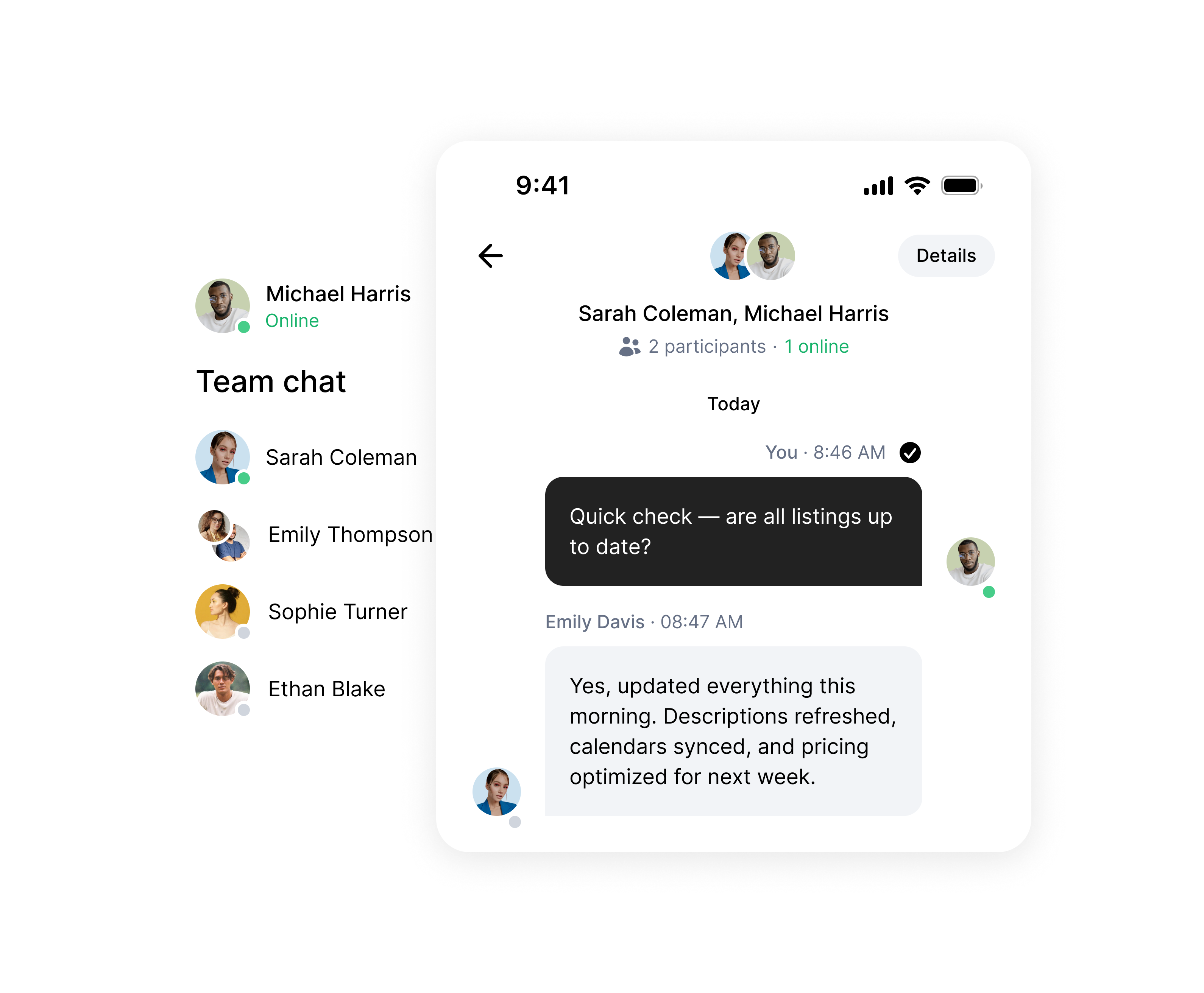 Create 1:1 or group conversations with your team. See who's online, who's typing, and coordinate seamlessly across all your properties.