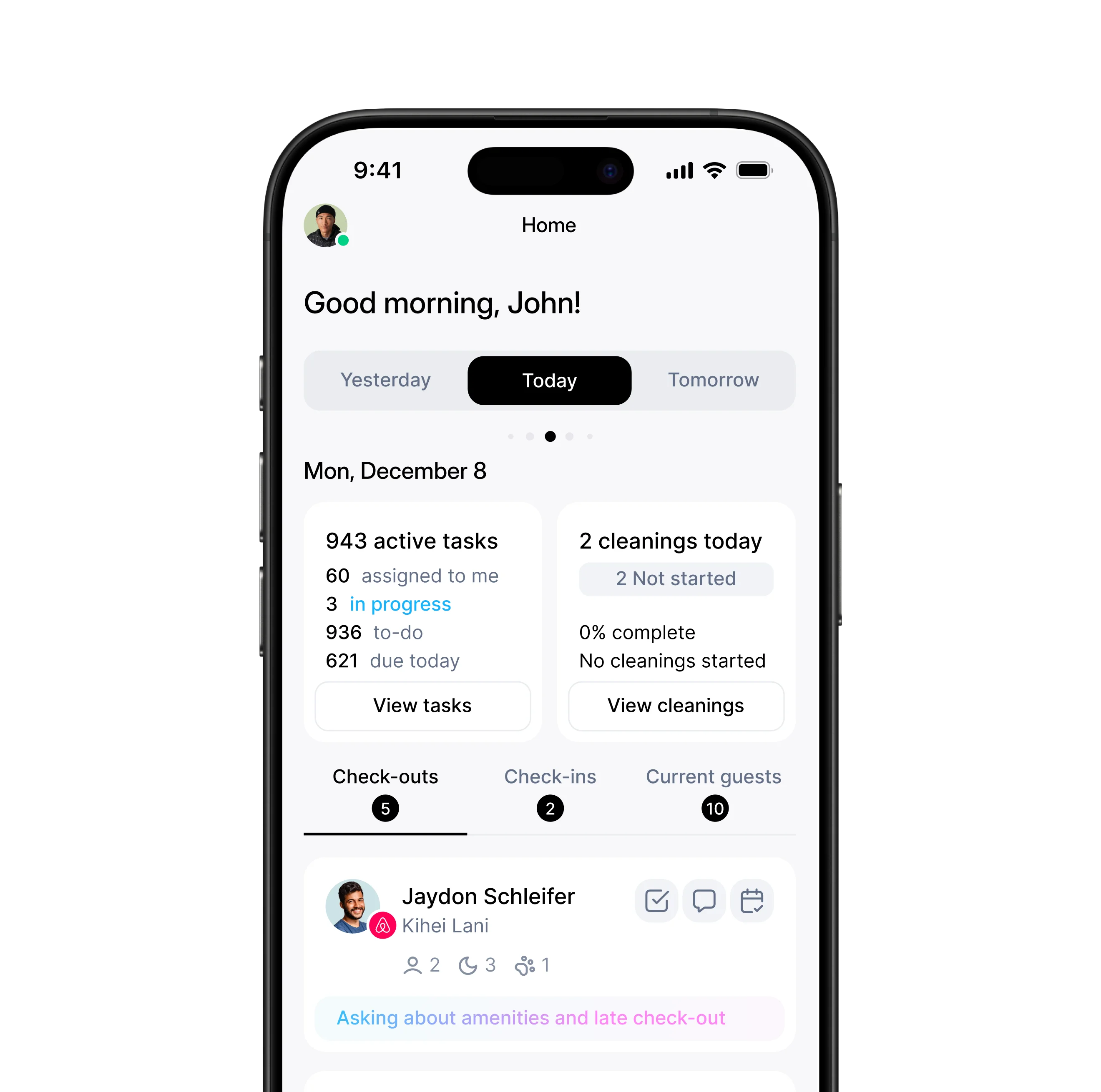 Automatically generates maintenance tasks from guest messages and reviews, with auto-assignment and status tracking.