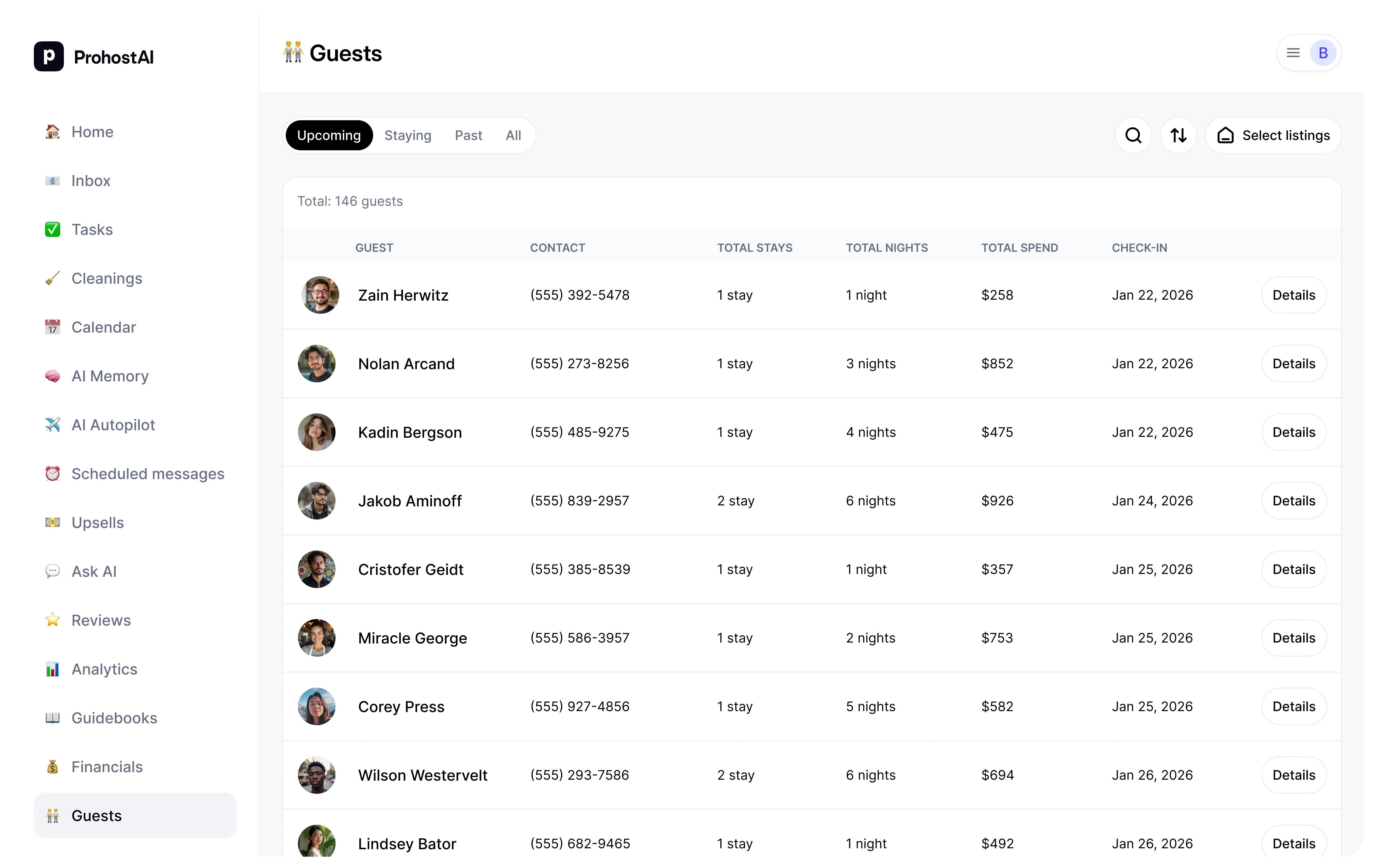 Filter guests by status (upcoming, staying, past), by listing, or search by name, email, and phone.