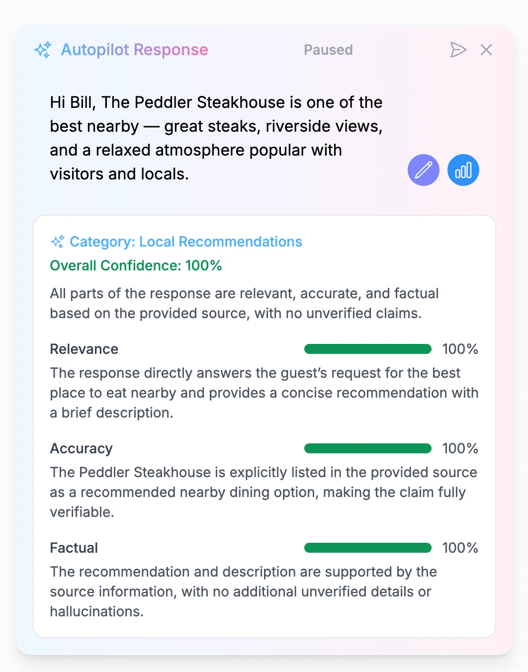 The AI has a confidence level for each message it writes. Click on the 3 bars on bottom right of an Autopilot message to see the AI's confidence in that message.