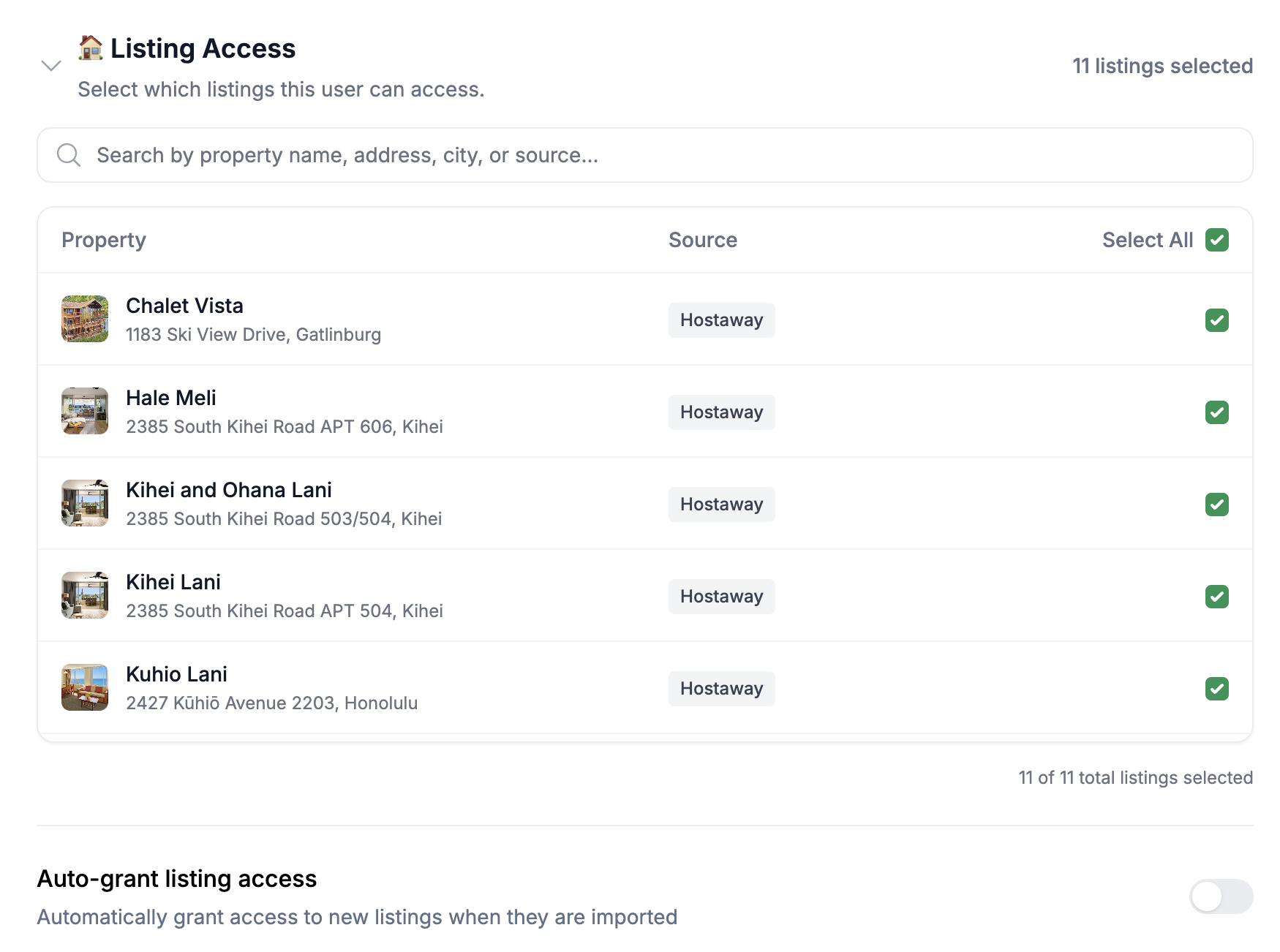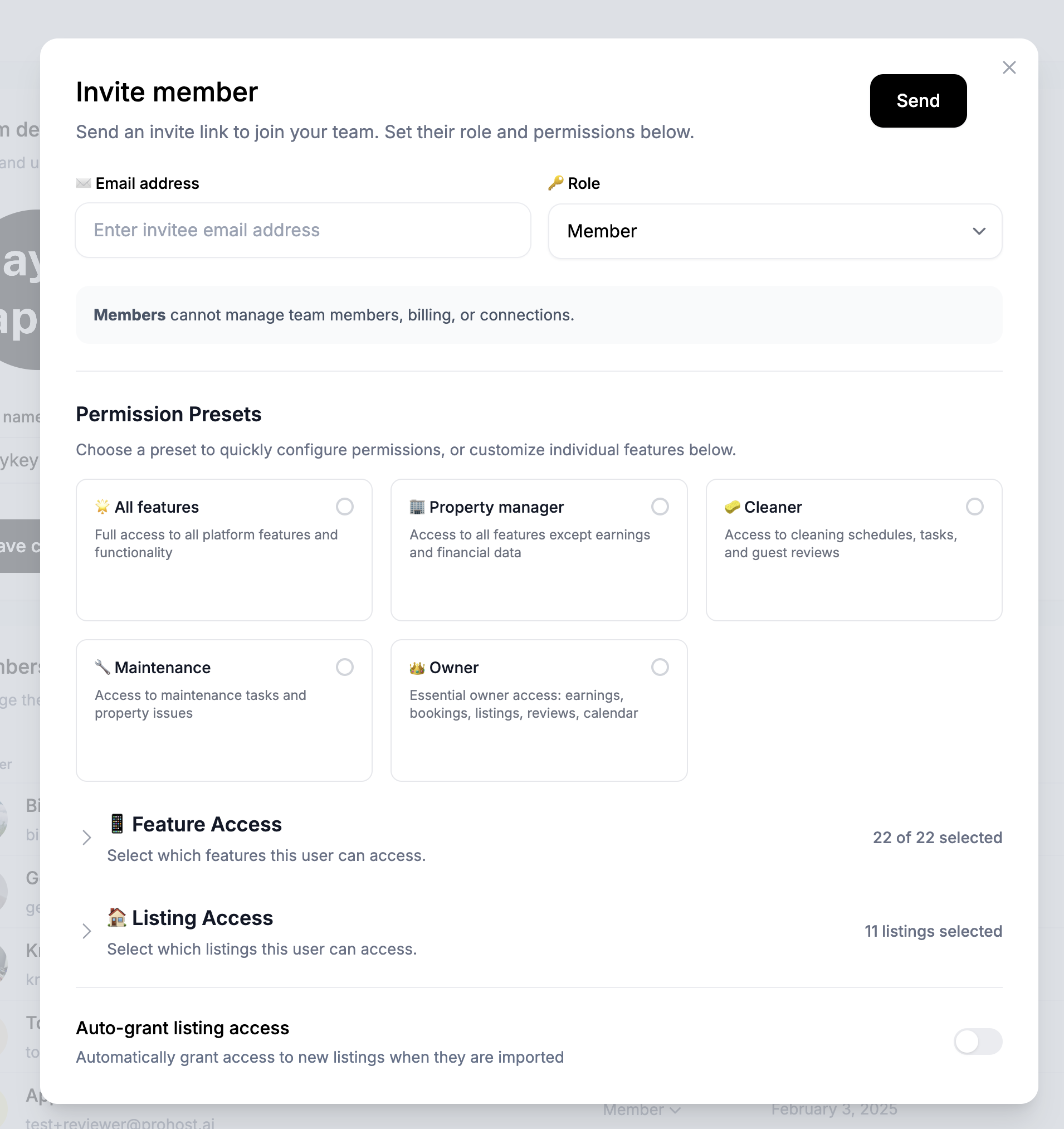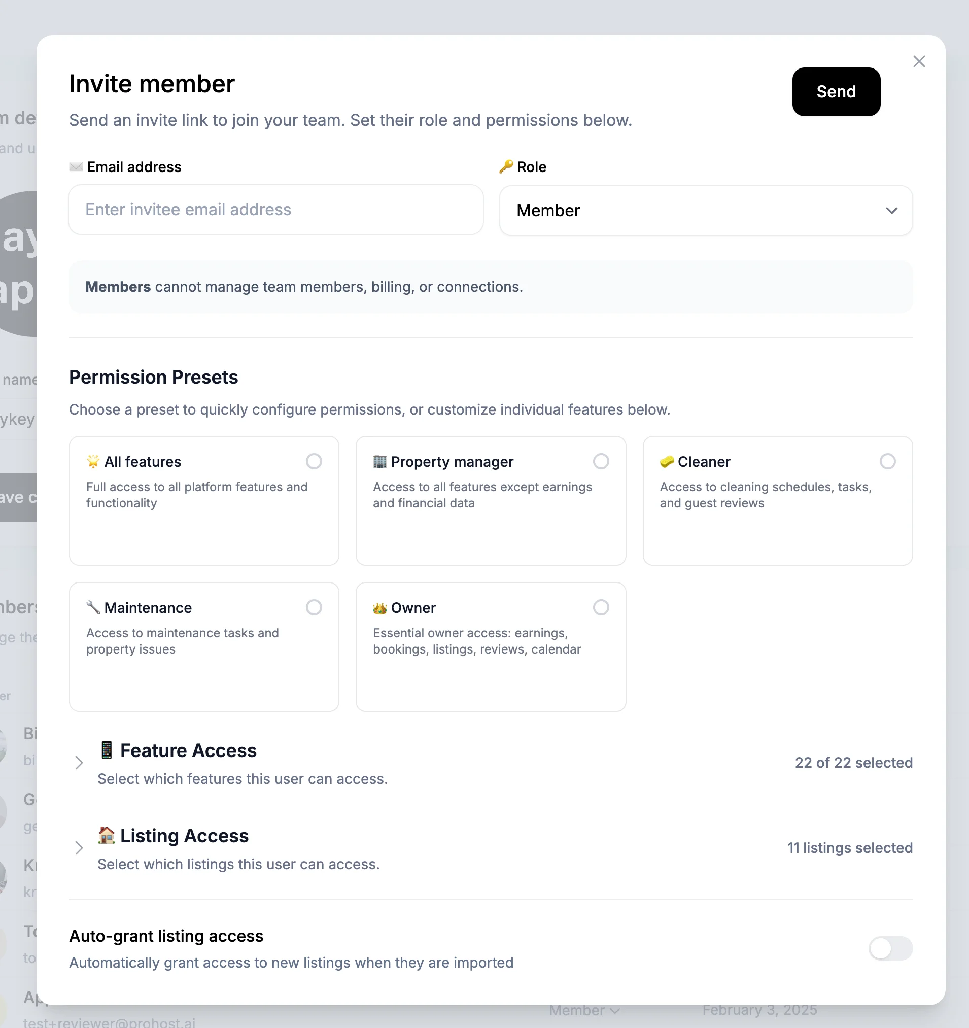 Note: On the bottom, you can choose to "Auto-grant listing access" for new listings. This is suitable for a team member who should always have to all your listings as they are added to ProhostAI.