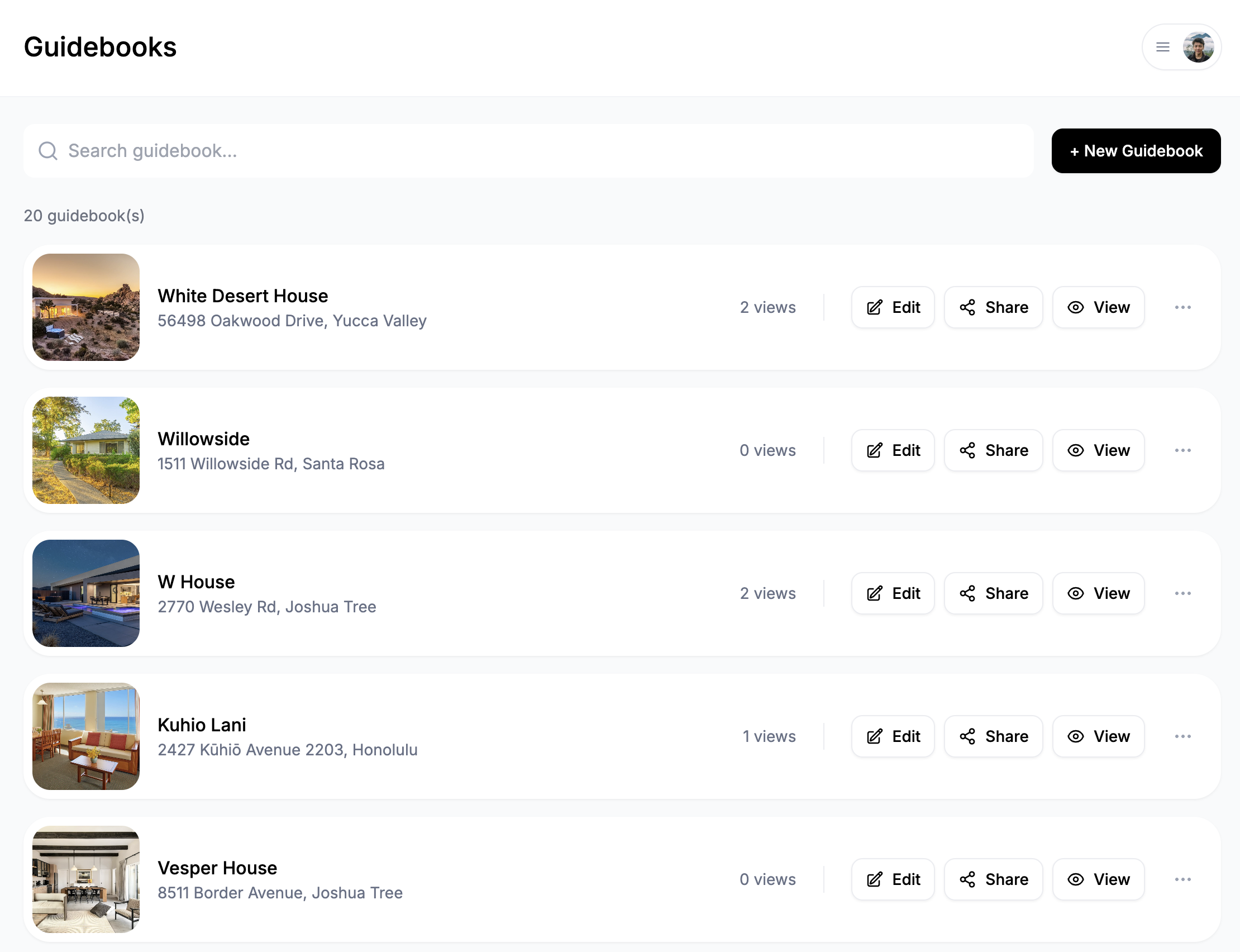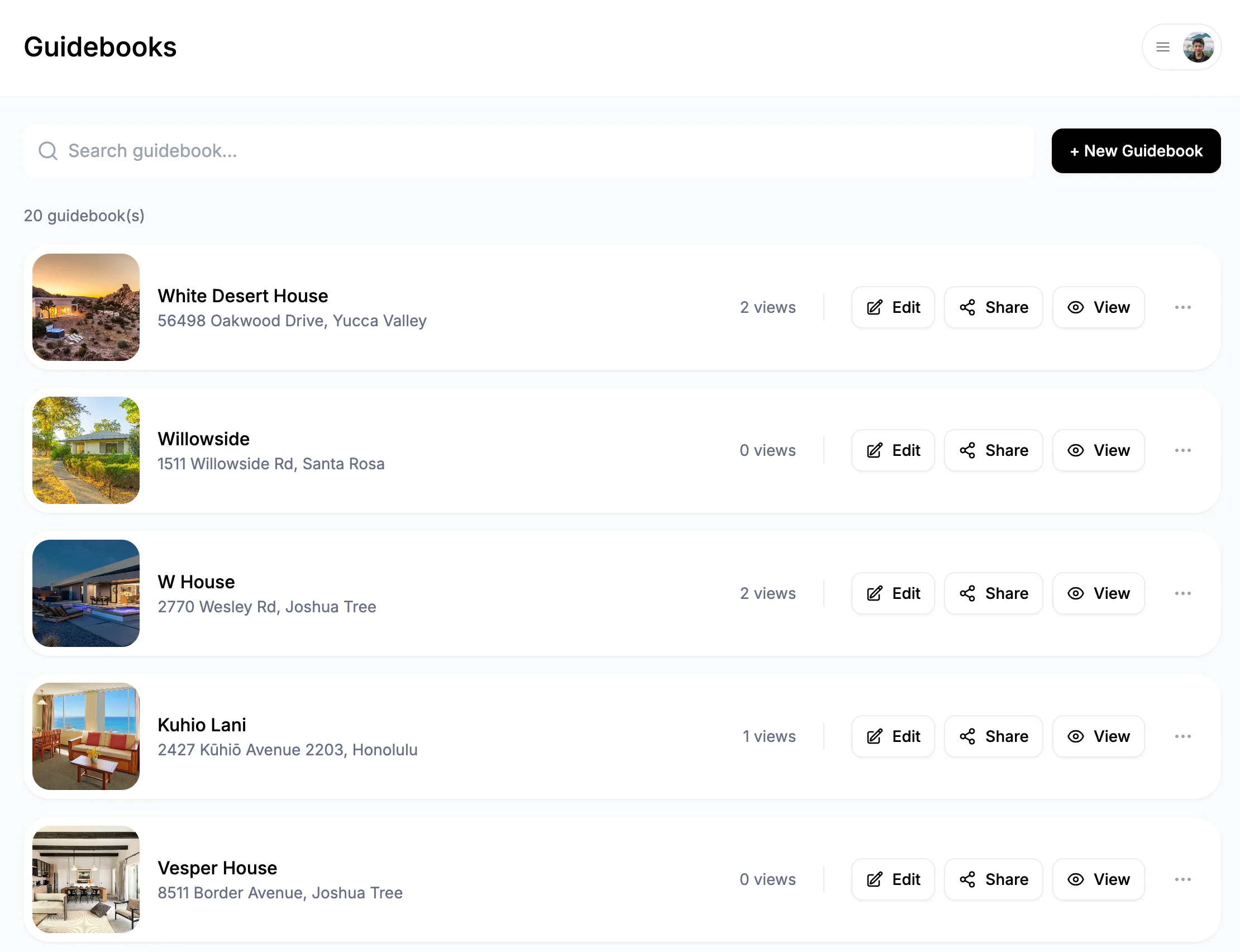 You can click "Edit" to edit the guidebook, "Share" to copy a link to share with your guests or "View" to view the guidebook as a guest.