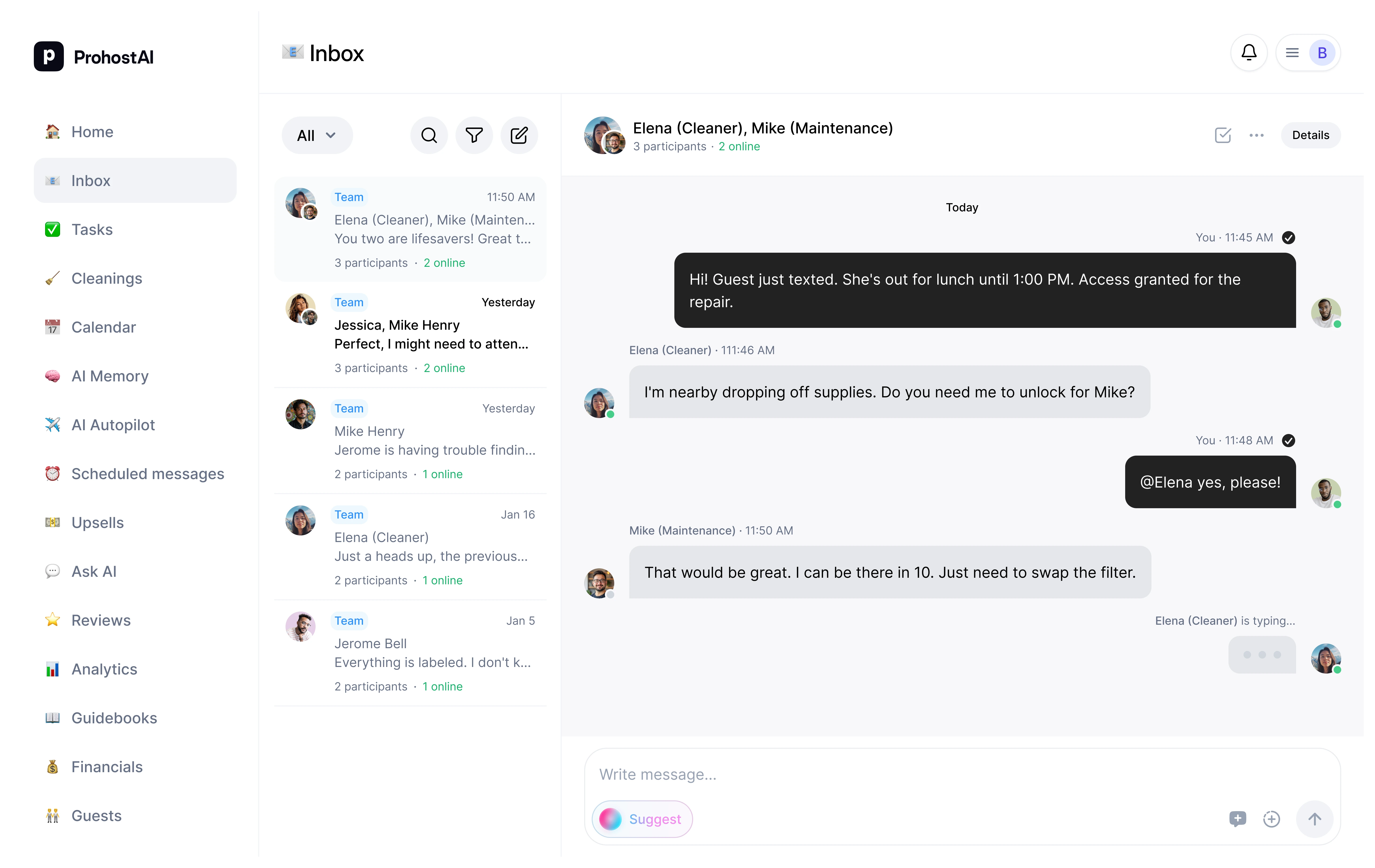 Create 1:1 or group conversations with your team. See who's online, who's typing, and coordinate seamlessly across all your properties.